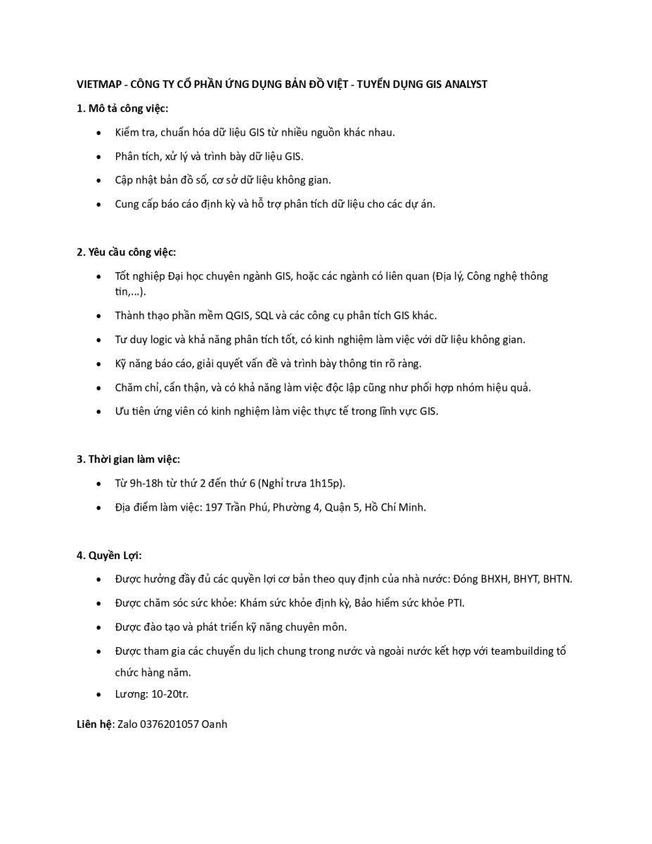 CÔNG TY CỔ PHẦN ỨNG DỤNG BẢN ĐỒ VIỆT TUYỂN DỤNG GIS ANALYST